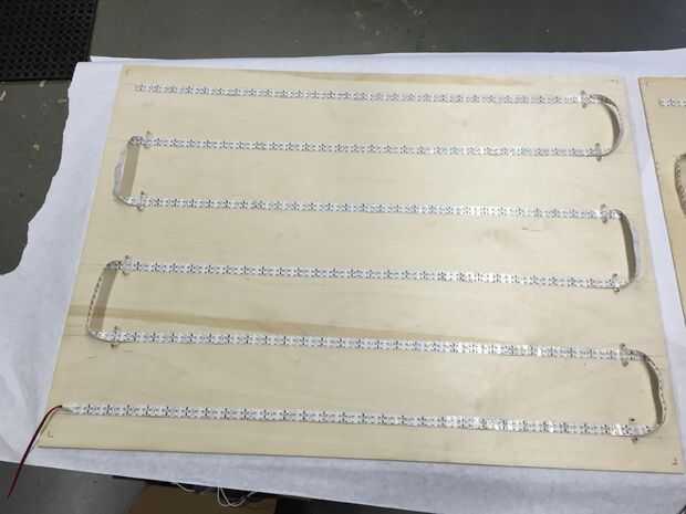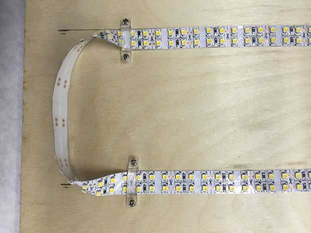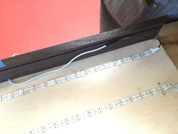 Usé una tira de LED de doble fila de iluminación más brillante. Blanco caliente otra vez. Cinta de pegar más algunos claro soportes para asegurar nada pelado. En lugar de cortar en pedazos y un montón de alambre de conexiones, sólo doblar la tira alrededor de cada fila.