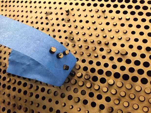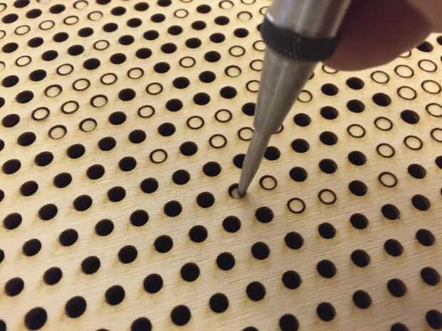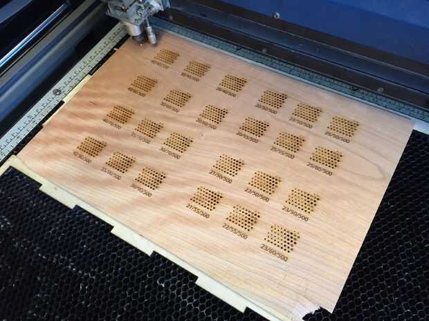 El mayor problema fue encontrar ajustes que aseguraron los puntos fueron completamente cortado y no pegan en el material. Como con todos los cortes láser, el balance primario es entre velocidad y potencia. Demasiado lento o demasiado de gran alcance y el material se quema o deformación. Demasiado rápido o demasiado débiles y los agujeros no ser completamente cortados, que requieren horas de empujando hacia fuera con una aguja.