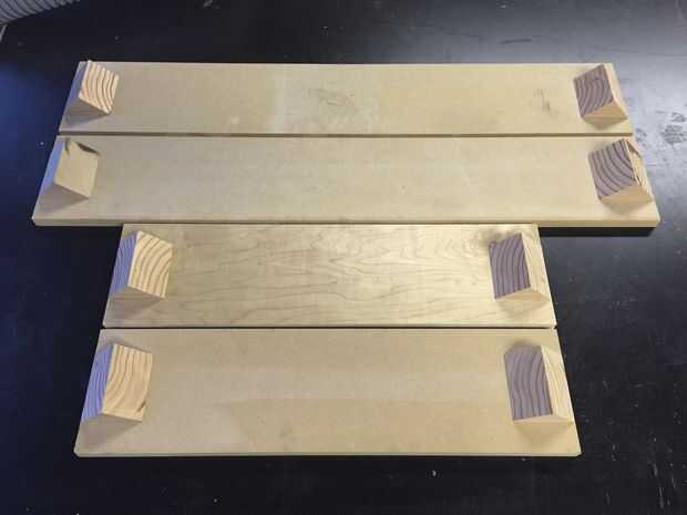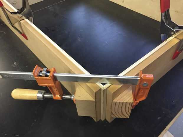 Primero construí abrazadera plantillas para proporcionar la presión constante a través de las juntas a inglete. Éstos eran tablas de desecho plano cortadas ligeramente menor que las longitudes de las piezas del marco, con 45° chatarra bloques pegados y atornillados en. Más tarde, descubrí una abrazadera de correa buena hizo éstos innecesarios.