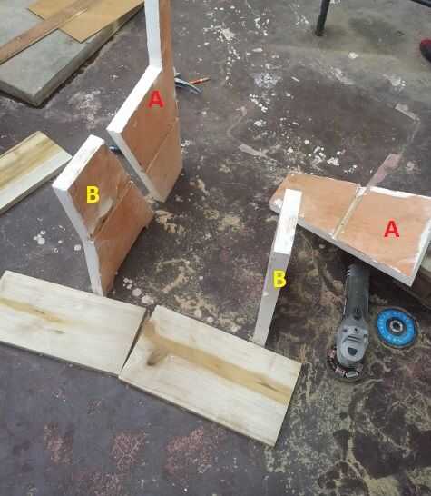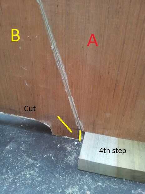 A continuación coloque el paso 4 en la sección 'A'. Empuje al ras con la sección B . Marcar un ángulo recto hacia abajo y cortar. Hice esto para que no hubiera algún espacio entre la sección y paso A. La otra opción sería cortar el lado largo del paso en un ángulo de 20 grados. Descubrí que esto es más fácil.