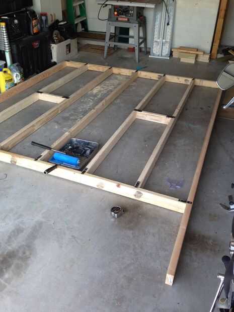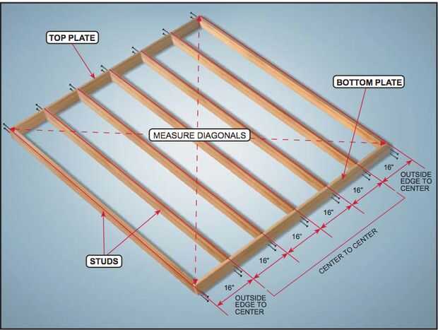 A partir de la medida exterior 16 pulgadas al centro de la siguiente 2 X 4. Hacerlos todos 16 pulgadas separación centro a centro. Puse dos trozos pequeños para mayor apoyo en las columnas interiores.