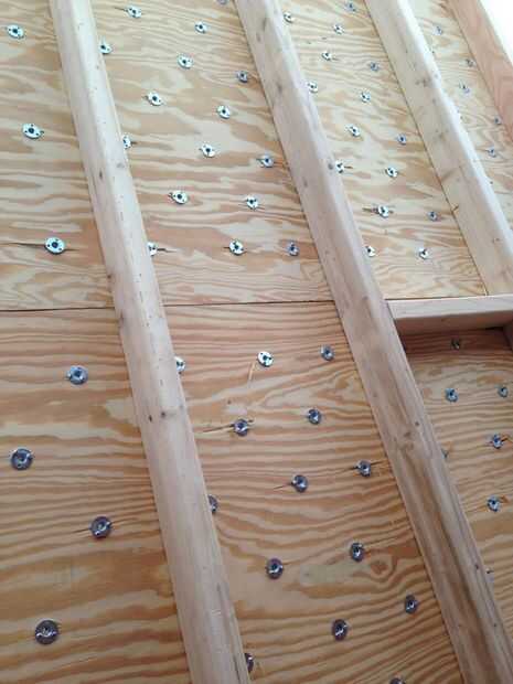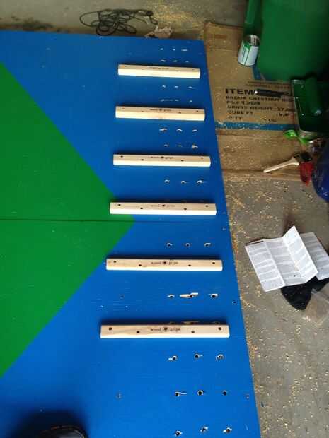 3) ahora es el momento para aprovechar los agujeros de sus bodegas y las tuercas en T. Puede poner en cualquier intervalo o simplemente mantenerlos tan al azar como usted quisiera. Una guía de escalada en Internet dice que puede tener una hoja de 4 X 8 de madera contrachapada hasta alrededor de 250 T-Nuts. Creo que la mina tiene 150 por hoja. Mi espacio aquí es de 3 pulgadas entre las líneas verticales y 4 pulgadas entre líneas horizontales y marqué cada uno de otros para no tener mi pared tan congestionado.