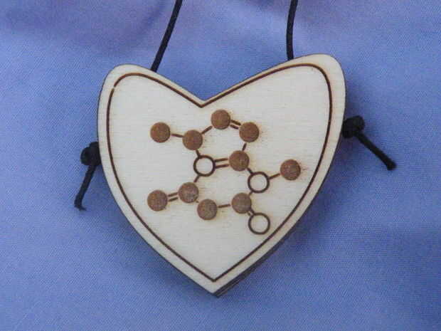 Me di cuenta de que el mecanismo de escalada realmente no necesita brazos para trabajar y también la usé en este corazón colgante - el diseño de la molécula es la teobromina, la molécula del cafeína-como que hace chocolate nos hagan sentir bien.