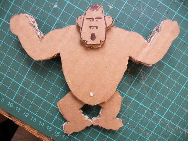 Cuando el pegamento esté seco, las piernas de la ranura en la ranura en la parte inferior del torso, luego deslice un trozo pequeño de palillo o pincho a través de las capas para fijarlo mientras que dejar que haga pivotar de lado a lado. Una gota de pegamento frente y parte posterior será mantener el palillo en su lugar, pero tenga cuidado de no pegar las patas al palo, o no serán capaces de swing.