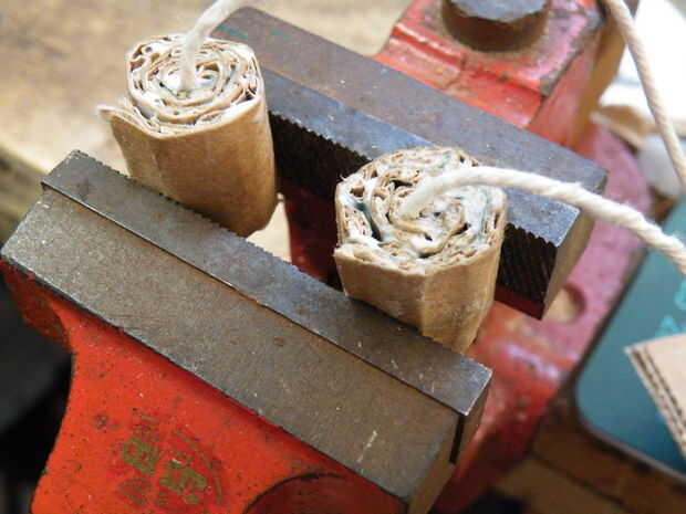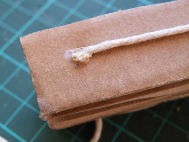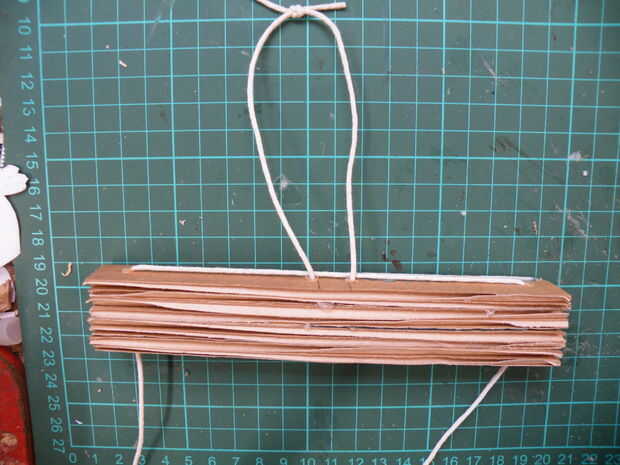 - Hice "granos" por longitudes cortas de corte de la tarjeta de cartón corrugado, pegado a lo largo de su longitud y luego los enrollándolo alrededor de los nudos extremos de la cadena.