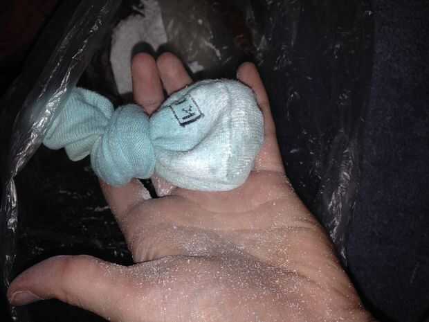 Rodillo y exprimir el bolso de la tiza en las manos hasta que el calcetín se pone blanco. Esto le permitirá saber que el calcetín es suficientemente delgado. (Importante Asegúrese de que el calcetín no tiene todo... Entonces agujeros microscópicos naturales son lo suficientemente grandes como para obtener el derecho sobre de tiza en las manos)