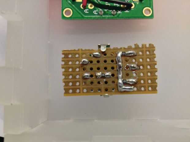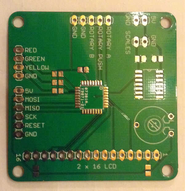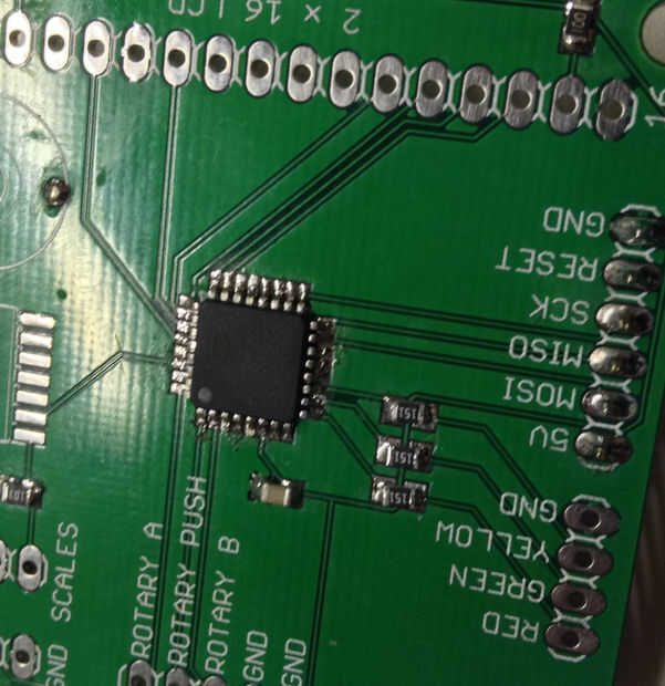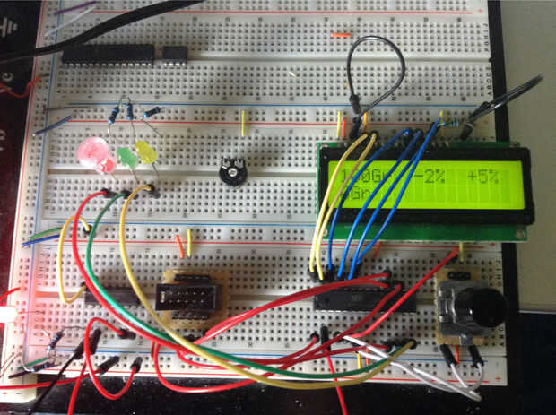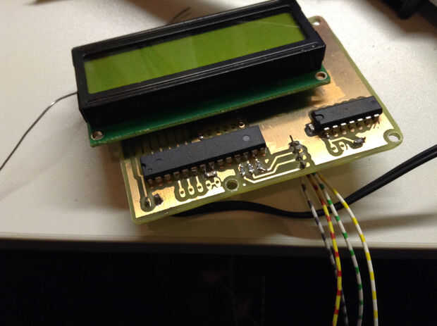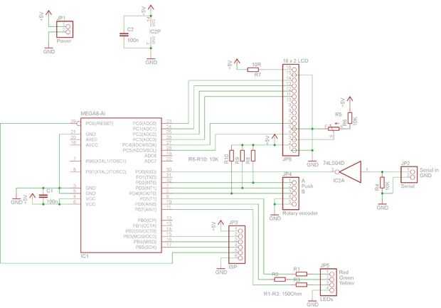 La entrada en serie está conectada al PD0 (RXD) pero eso es un problema, porque la señal es de 9V y también se invierte. Usted puede comprar IC dedicado a resolver este problema, como el CI MAX232. Pero para este proyecto fue más fácil y más barato utilizar un inversor de 74LS04D en combitation con una resistencia de 10K. El resistor de 10K trae el nivel de voltaje de la señal dentro de límites aceptables y la 74LS04D invierte la señal para que lo entienda el Atmega8.