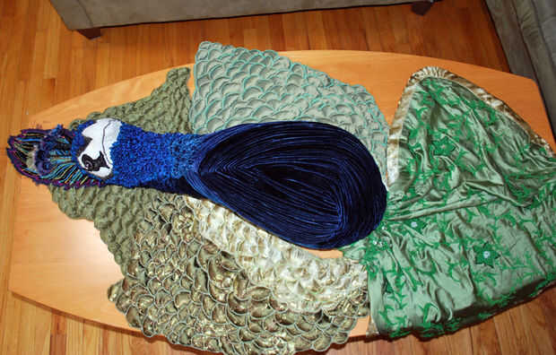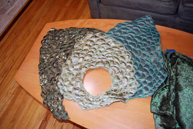 Entonces saqué el panel superior de terciopelo verde oliva, verificado para asegurarse que la parte de atrás estaba en buena forma, lo entregaron nuevo y dry-fit lo encima de todas las secciones. He fijado y cosido en su lugar casi completamente, excepto una pequeña área a la derecha del lado donde las piezas no encajan bastante juntos. Al vapor el panel entero hacia fuera y me hizo otro montaje seco, agregar el pavo real y la falda en la mezcla. Por suerte todo encajan bastante bien. El agujero para la base de pavo real era más grande que yo quería, pero sabía que podía arreglar eso cuando os adjunto el acolchado en la parte trasera del scooter.