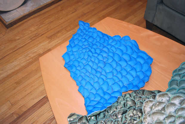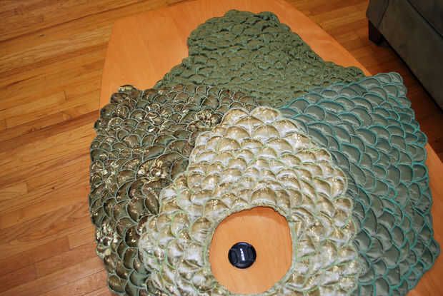 Después hice los primeros tramos de la 2 escala, cosí la curva del lado izquierdo y la parte superior escala al igual que en los pasos 6, 7 y 8. Luego hice un empalme en seco. La curva de la izquierda (en la tela de tapiz verde oscuro) se extendió como cosí las escalas, pero eso no fue un problema. Pude reunir ligeramente alrededor del centro en forma de huevo. Cubrió en su lugar, zig-zag había cosido abajo y al vapor de toda la pieza.