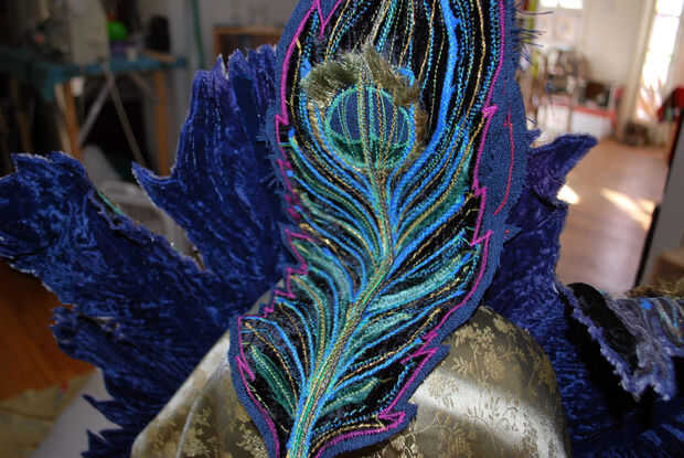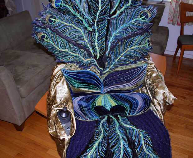 Mis 2 primeros intentos de plumas del pavo real no eran razón para los fans de la pluma o el asiento. Me puse un poco demasiado elegante y había les había animado para arriba con un esbozo de hilo magenta. Pero cuando ponerlos juntos y había drapeado en la parte superior del reposacabezas, hicieron un buen puente entre la cortina y el ventilador de la pluma. Excelente noticia.