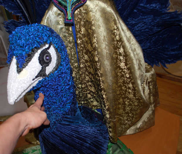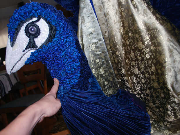 Luego le puse el cuerpo de pavo real en la parte trasera del scooter. La ubicación era buena pero algo faltaba. La tela drapeada sobre el scooter era agradable, pero necesitaba algo para hacer una transición suave en la textura del cuerpo del pavo real. Está bien. Volver a la mesa de dibujo!