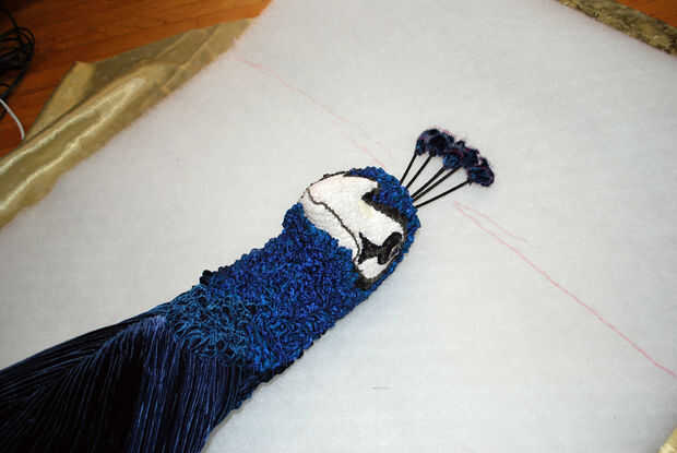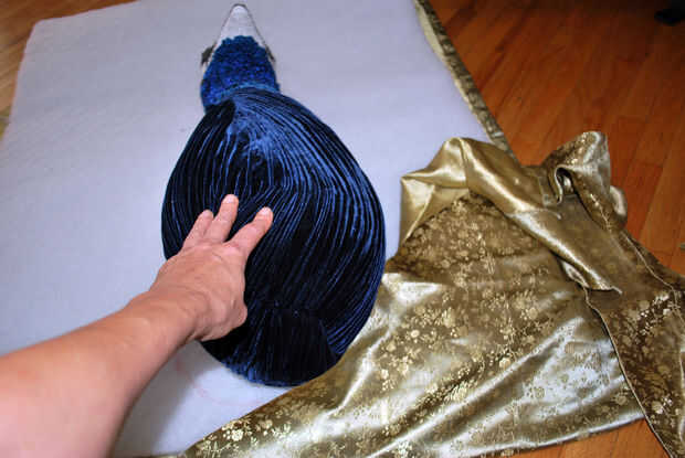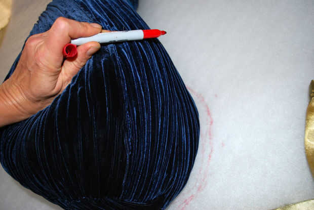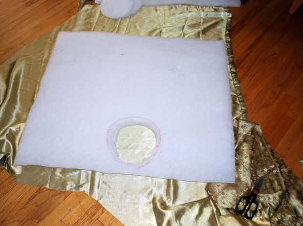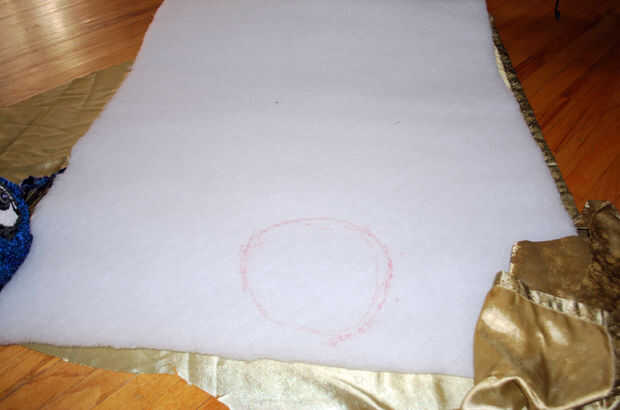 Me ha gustado a la tela de cortina que utiliza, y por suerte un amigo me donó 4 paneles de las cosas! Tomé otra pieza y puso en el piso, el lado brillante hacia abajo. Luego puse a mis hojas de bateo, uno encima del otro. Sacó de un círculo en la parte inferior del bateo, sobre donde quería el pavo real para ser. Entonces tomé el pavo real y probado forrar su base con el círculo. No toda la razón, así que sacó el Sharpie rojo otra vez y trazada alrededor de la base del pavo real. Consiguió un poco desordenado, pero pensé que podía usar el interior líneas. Luego puse el pavo real hacia atrás hasta la marca la parte superior. Quería que el acolchado para extender encima de la cabeza y cubrir el reposacabezas. La marca de 1 1/2" por encima de la cabeza parecida adecuada. Dibujé una línea rugosa en la parte superior de bateo en ese nivel.