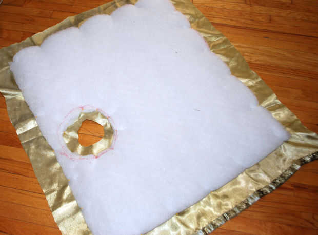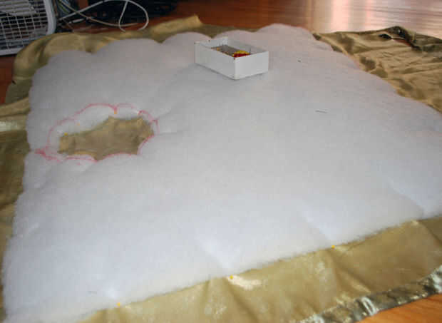 Dejé mi habitación en el círculo porque no estaba seguro de cuánto serían comprimir la guata y la tela cuando conseguido acolchada. Es generalmente más fácil recortar los excesos que a añadir en el extra más tarde. Una vez que todo estaba cortado, me tiró de la tela debajo del acolchado para mantenerlo agradable y liso y cubrió las capas juntas. Ahora podía mover la falda.