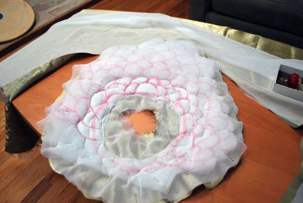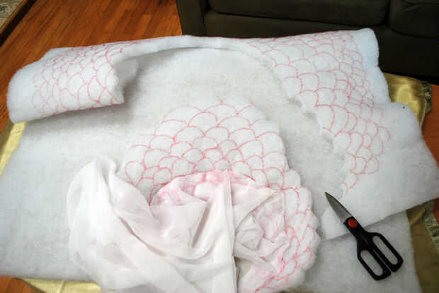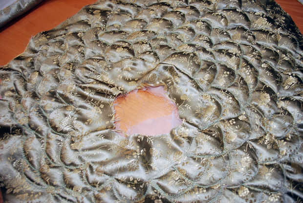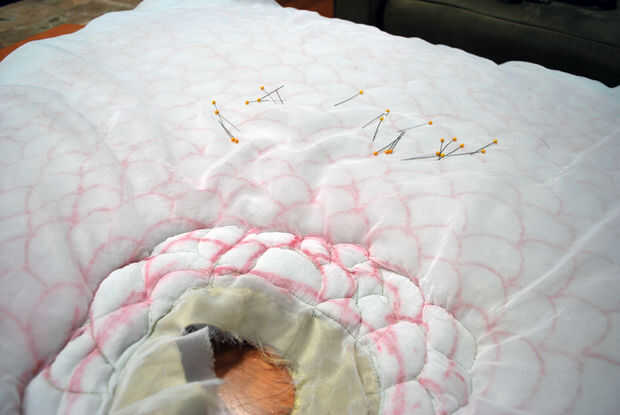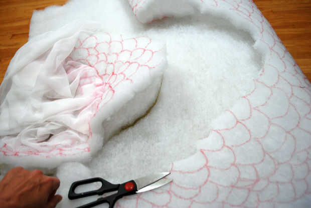 Saqué mis alfileres, pelada encima de la tela escarpada y empujó en el agujero para mantenerlo fuera del camino. Entonces empecé a cortar la primera capa de bateo a lo largo de la escala roja marcando líneas. Hice una especie de forma de huevo alrededor del agujero. Moví el cortar pedacitos de la capa superior del camino y cortar la capa inferior de bateo para igualar. Cuando bateo extra fuera del camino, corto a la tela de la cortina por lo que fue aproximadamente 1" más grande que la forma de huevo y cubrió todas las capas juntas sin problemas.