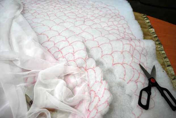 Esta pieza era mucho más fácil coser. Utiliza una puntada recta para edredón en las escalas, luego usé una puntada de zig-zag estrecho, apretado y pasó cada costura para hacer a cada escala se destacan. La costura era limpiarla y la tela no manojo hacia arriba como cosí. Desde mi primer intento en las escalas de costura hasta ahora estaba apagado, no me preocupa mantener las líneas que había dibujado. Como mis curvas cosidos eran agradable y suave, no importaba.