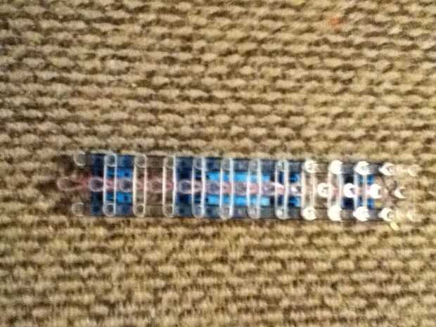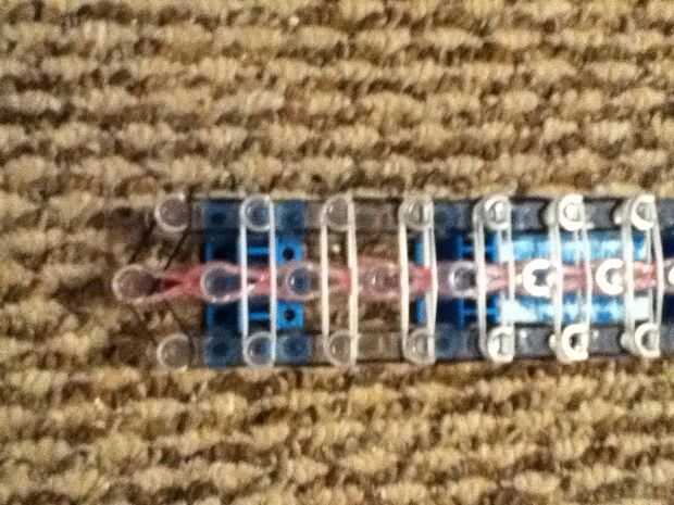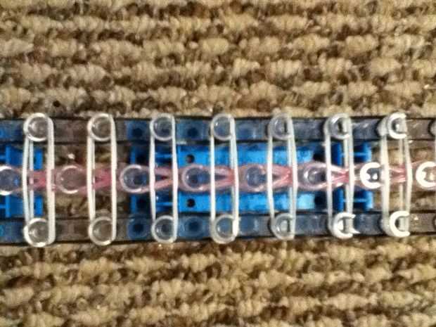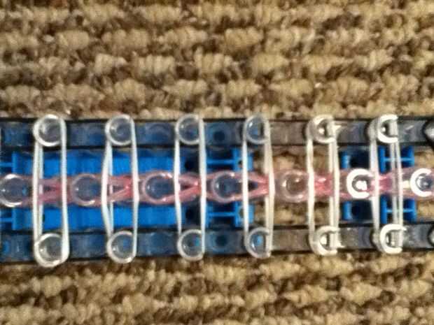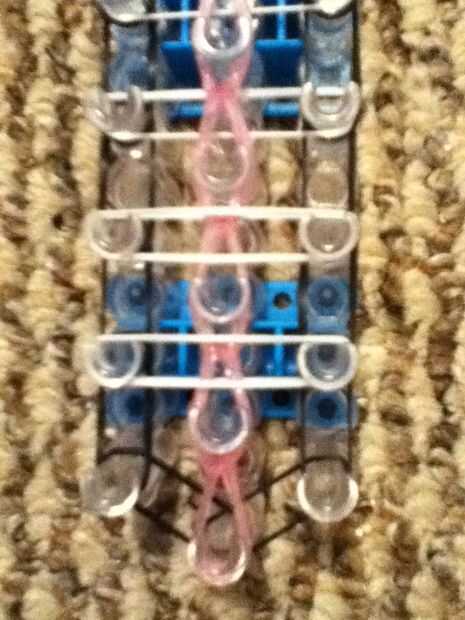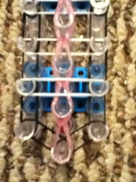 Paso 1: Obtener las herramientas Necesita su telar del arco iris, 2 colores de bandas de goma, un clip de c y un gancho.Paso 2: a partir de Una banda de goma en los dos pasadores de la torcedura. Y hacerlo otra vez con otra banda elástica.Paso 3:Gire