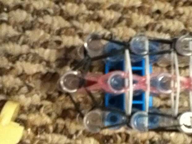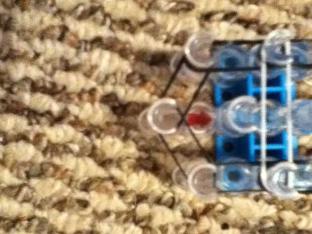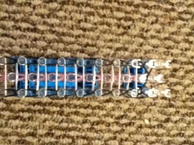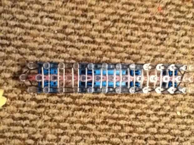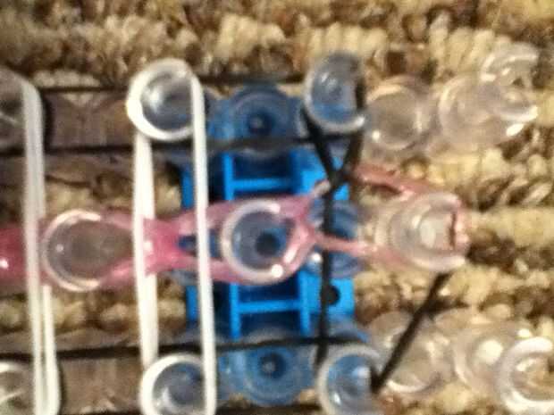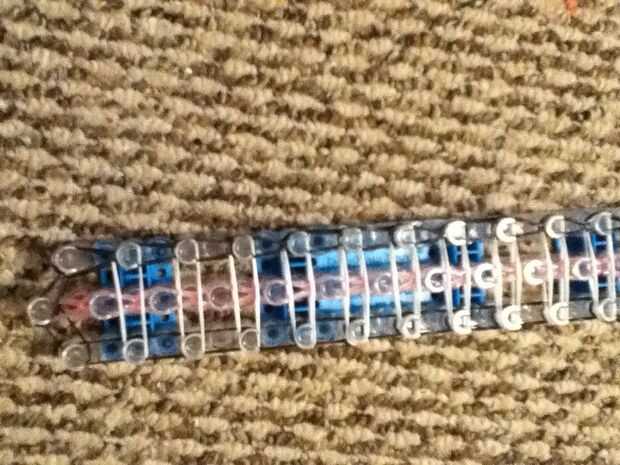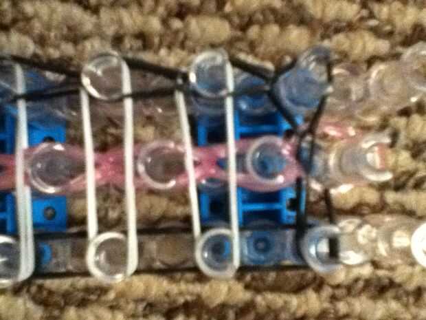 Paso 1: Obtener las herramientas Necesita su telar del arco iris, 2 colores de bandas de goma, un clip de c y un gancho.Paso 2: a partir de Una banda de goma en los dos pasadores de la torcedura. Y hacerlo otra vez con otra banda elástica.Paso 3:Gire