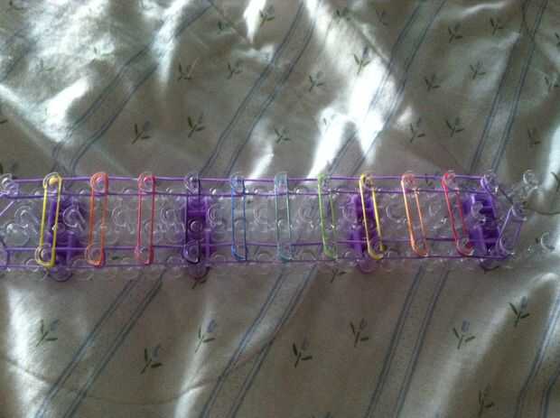 esto es un braclet muy fácil y divertido para hacer. Esperamos que disfrutes!Paso 1: materiales Se necesita: un telar, gancho, elásticos y un clip de C.Paso 2: Colocar los elásticos Primero escoger tres colores y a la clavija central. Sacó su color e