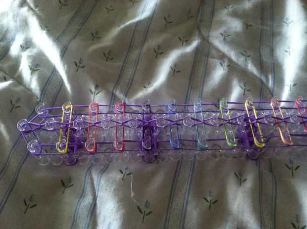 esto es un braclet muy fácil y divertido para hacer. Esperamos que disfrutes!Paso 1: materiales Se necesita: un telar, gancho, elásticos y un clip de C.Paso 2: Colocar los elásticos Primero escoger tres colores y a la clavija central. Sacó su color e