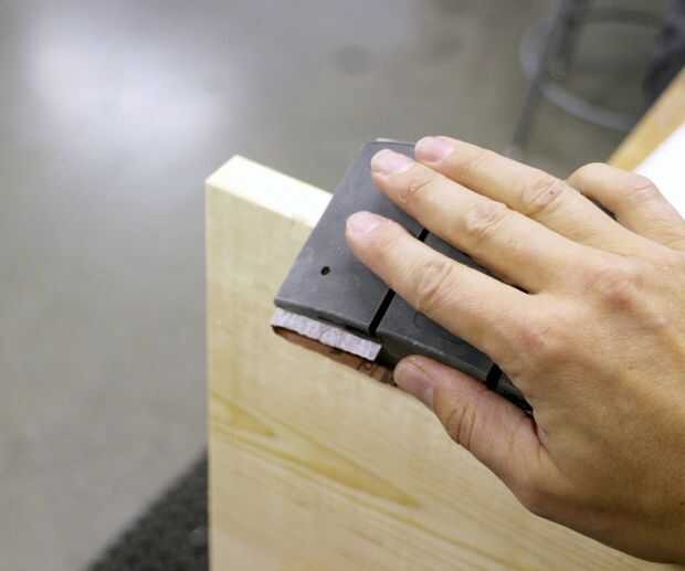 Usando un bloque de lijar y papel de grano arena 320, suavemente lijar todos los bordes de los estantes.