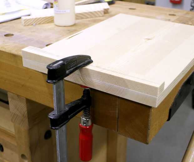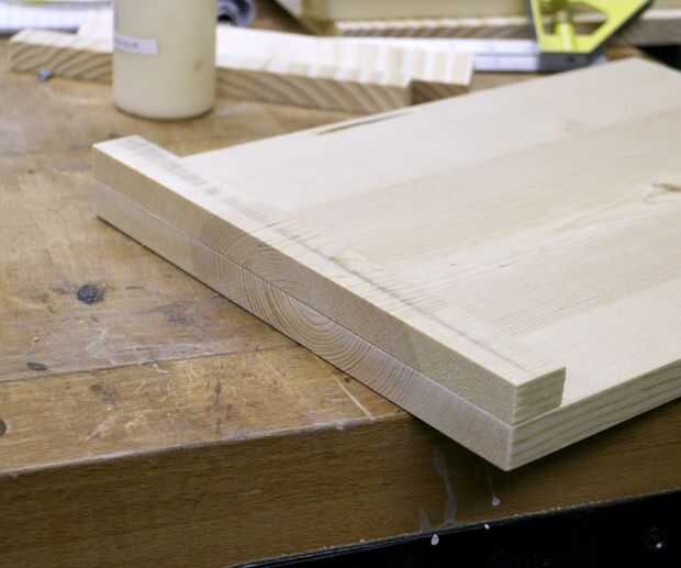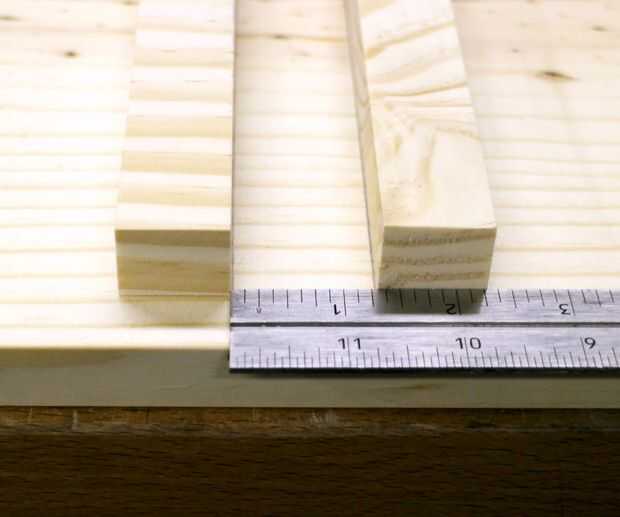 Para el estante superior (Nº 1), cortar 1" pedazo de ancho de madera de pino para el grosor de la plataforma superior. Pegamento en el borde inferior de uno de los extremos de la plataforma.