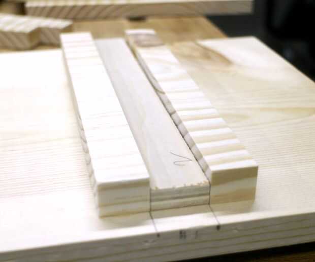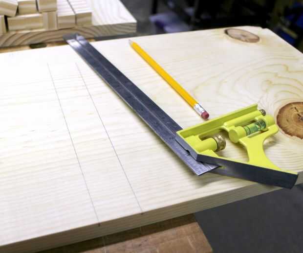 Usando una escuadra de carpintero, dibujar líneas en la parte inferior de los estantes que se alinean con las marcas de lápiz realizadas anteriormente. El espacio entre las dos líneas es qué tan amplia debe ser su cuña (aprox. 1 1/4")