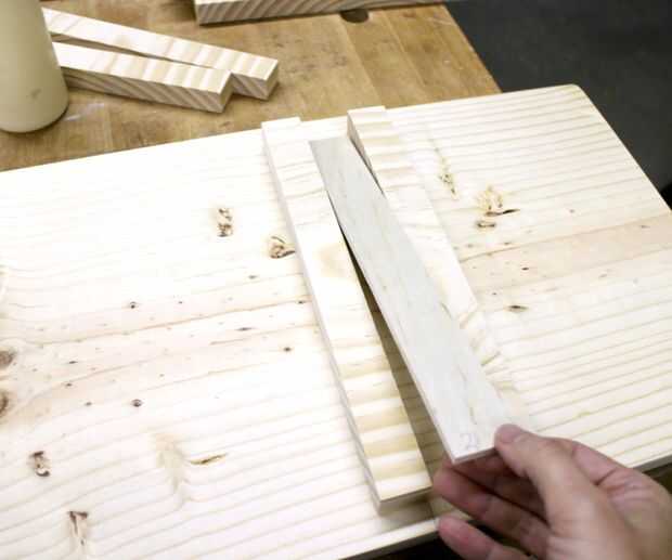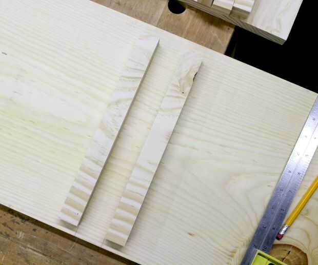 Con el cortado de piezas de madera de pino, cortar (6 x) 1" de ancho x 10" largo. Pegarlos en el exterior de las líneas en los estantes de 2-4.