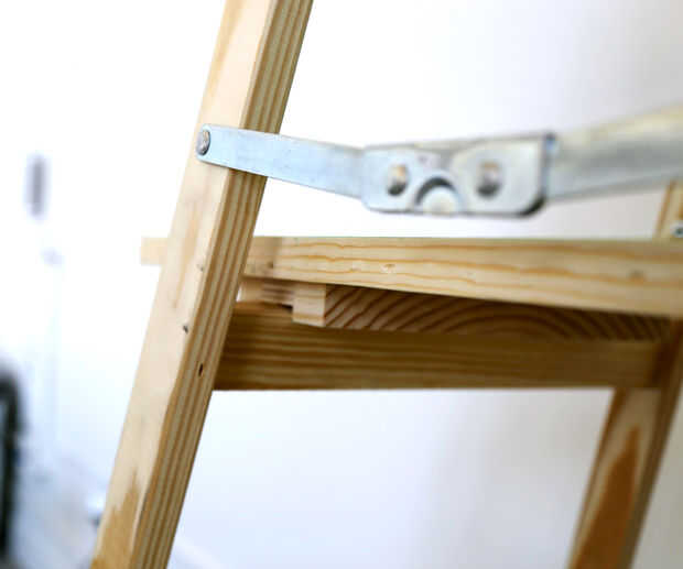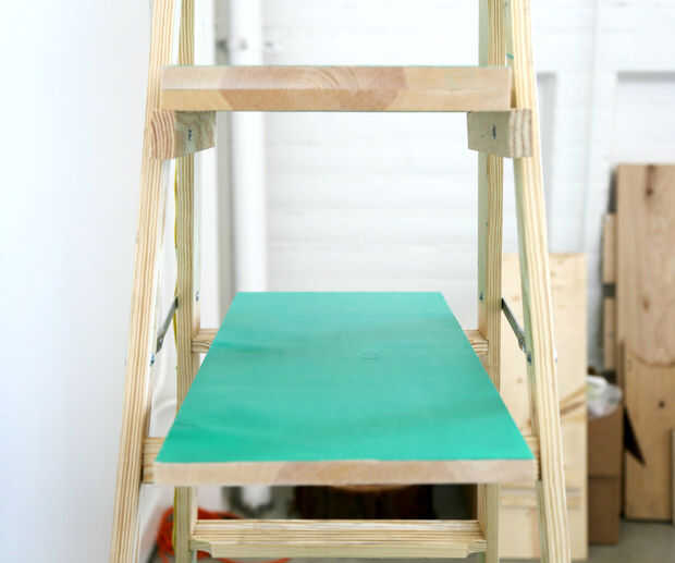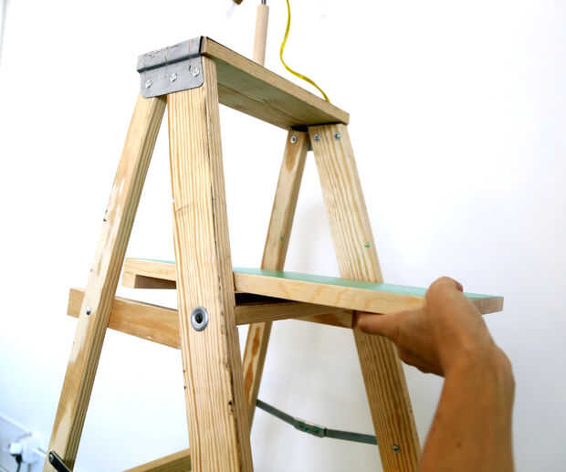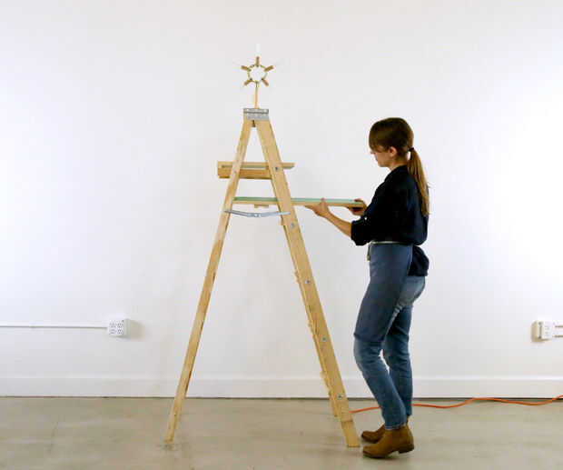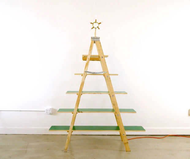 Una vez que has encontrado un buen lugar para su árbol, ha abrió la escalera e instalado la luz estrella árbol Topper si opta por hacerlo, ahora es momento de agregar los estantes. Colocarlos en sus respectivos peldaños, escalones, haciendo que los estantes estén centrados entre las columnas.