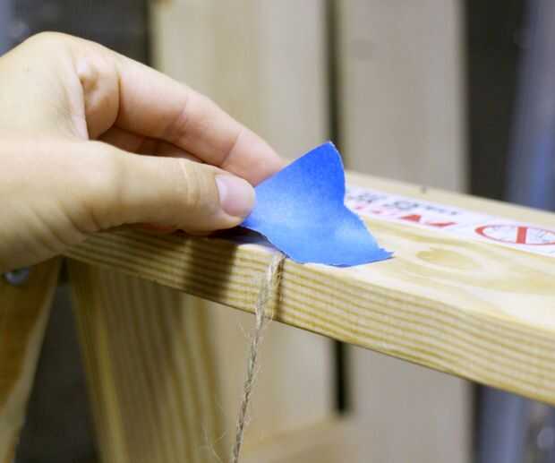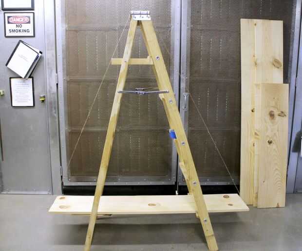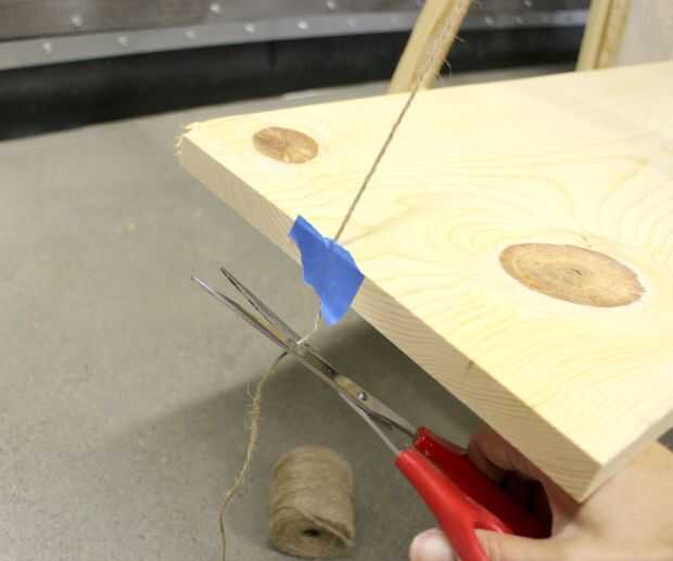 Luego tomar alguna cadena o de la guita y cinta de una longitud de la parte superior de la escalera en el centro del estante inferior en ambos lados de la escalera.