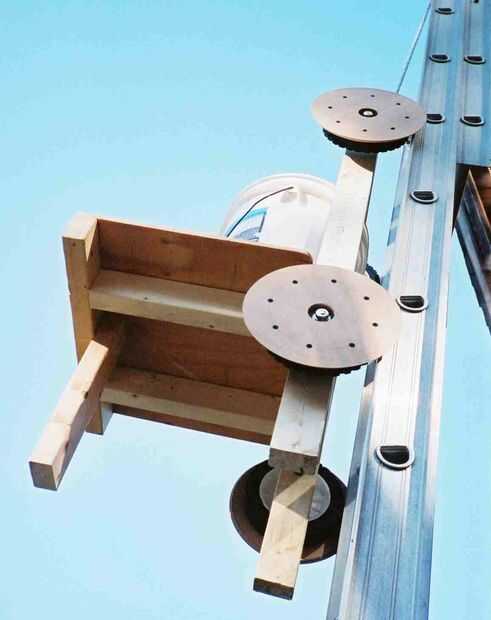 Esta vista muestra los detalles de la construcción baja de pony. Es básicamente una silla de tres patas, la tercera pata a la mitad de la parte inferior de la plataforma de carga ("asiento"). El eje inferior se coloca de modo que los discos de madera conectados a las ruedas están por debajo de la parte inferior de la plataforma de carga tanto tiempo pueden poner objetos de carga a través de la plataforma sin interferir con las ruedas. Hice rieles laterales de mi pony 36" largo de 2" de madera de 3"(real 1-1/2" por 2-1/2") vendido en casa centros como"tacos." Las longitudes de los otros componentes dependen de la distancia entre los rieles laterales de la escalera. Conecté a los miembros de marco de madera utilizando tornillos para madera pegamento y la cubierta. Mi plataforma de carga es un cuadrado de 18" 1/2" espesor de madera contrachapada de cuyas esquinas son recortadas hacia fuera para limpiar los rieles, y pegamento y yeso tornillos fíjela. Unos tacos de madera pequeños fueron atornilladas a la parte posterior de la plataforma para sujetar la parte inferior de un cubo de plástico de 5 galones.