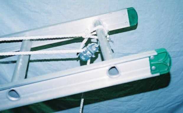 La polea de arrastre y una grapa para atar de la cuerda de izado se empernan a través del peldaño superior de la escalera. No interfieren con el funcionamiento normal de la escalera para que se queden en su lugar todo el tiempo.