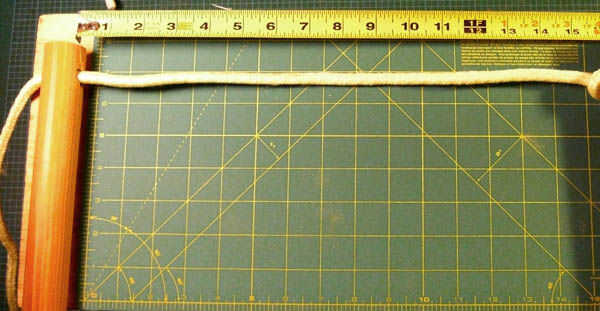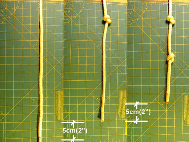 Este cuadro muestra que con cada nudo que se ata la cuerda se acorta por sobre 5cm(2"). Puesto que este diseño tiene un nudo en la parte superior y debajo de cada peldaño hay una pérdida de 10cm(4") por cada peldaño.