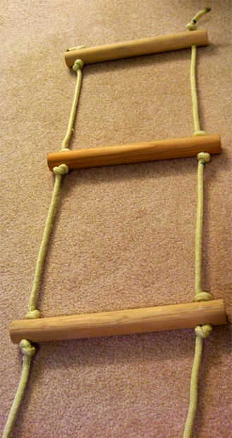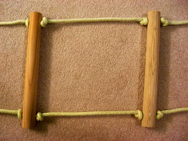 Extienda sus incluso dos largos de cuerda, comience con un nudo en el extremo de cada hilo en un peldaño y cuerda. Luego atar el peldaño roscado a cada lado, a la altura de 30,5 cm (12 pulgadas) y atar otro nudo. Hilo de rosca en otro peldaño y ate. Repita para cada lado hasta que todos los peldaños son de rosca y atados a la cuerda
