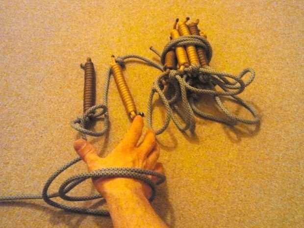 Otra forma es poco más complicado, pero el resto de la cuerda azul será en una sola pieza. Un lado de los peldaños de la cadena y nudo primero 1 metro desde el extremo del lado derecho. Tienes una cola y un soporte para el peldaño más bajo. Ahora el lazo de nudo bajo cada peldaño observando el espacio entre los nudos es exactamente 33 cm. Repita hasta que tenga nudos en un lado bajo los peldaños.  Después de pocos nudos podría llegar a ser complicado hacer estos nudos y reeve parte todo hecho. Debe ayudar la confección de 'envases de peldaños'.