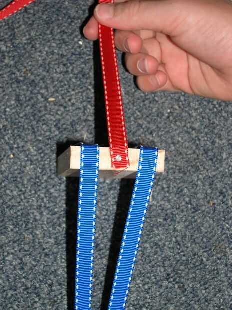La segunda Ilustración siguientes muestran lo que quiere su primer bloque para poner fin a como: dos cintas a un borde en la parte superior e inferior; la tercera cinta atado a los * otros * borde en el centro. Voy a llamar el par de cintas en la parte superior e inferior azul, ya que es lo que son en la imagen, mientras voy a llamar a la otra media 'roja.'