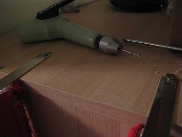 Apoye la escalera contra el gabinete alto y coloque en la parte superior con algunos pedacitos de metal.
