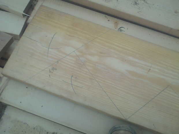 Tiempo a disposición de los largueros. Tomar la Plaza y poner la parte 7 a la izquierda y la 10.5 a la derecha y poner el 2 x 12 lo más lejos a la izquierda como se puede obtener con las 2 medidas todavía en el tablero y marque el exterior de la Plaza. luego tomar la marca de la parte 7" y llevar todo el resto del camino recto. Este es el escalón superior y se desconectará después