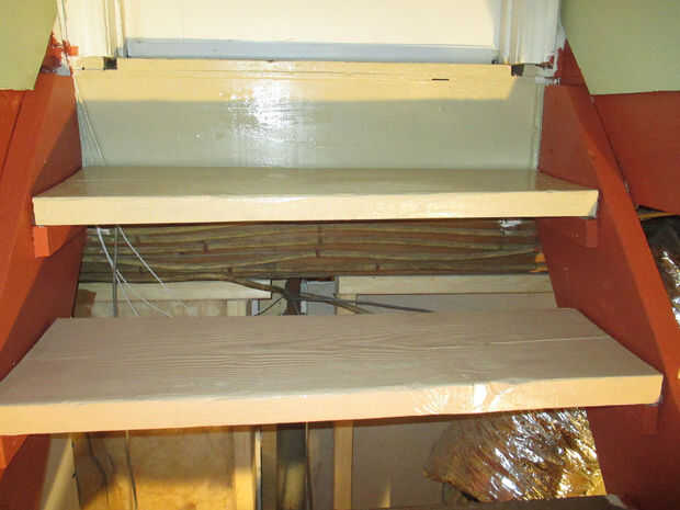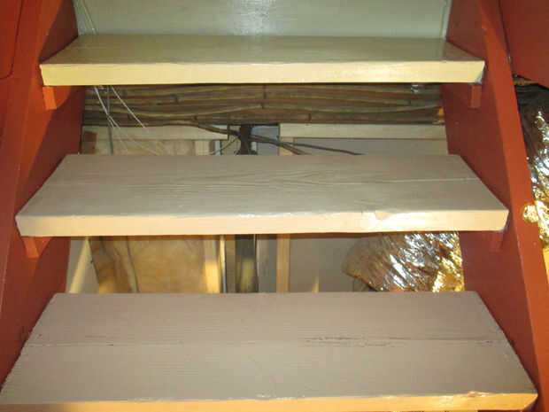 Para la relación de la pintura, empecé con sobre un medio galón de la pintura del piso de crema y agregar aproximadamente 2 onzas de naranja oscuro. La primera transición de la segunda escalera era tratamiento obvio, cada uno más un poco menos. Las 5 primeras escaleras debían también ser pintado por debajo, el segundo cinco no era necesario. Esto significaba menos pintura fue utilizada y por lo tanto cada adición de 2 onzas de naranja probablemente tuvo menos efecto de la relación general de la pintura como las transiciones iniciales de la escalera, pero difícil de notar. En su mayor parte era una transición evidente y calmante a la escalera abajo (esto puede no ser tan obvio en las fotos).