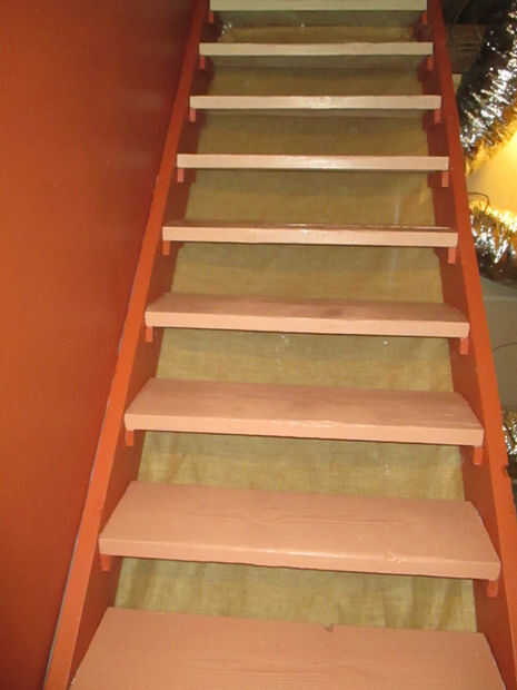 Decidí que no quería mirar la fea vista detrás de las escaleras cada vez que iba para arriba, así que con grapas de una longitud de arpillera a la parte inferior. Dio un buen telón de fondo, al tiempo que oculta lo que estaba detrás. Fácil!
