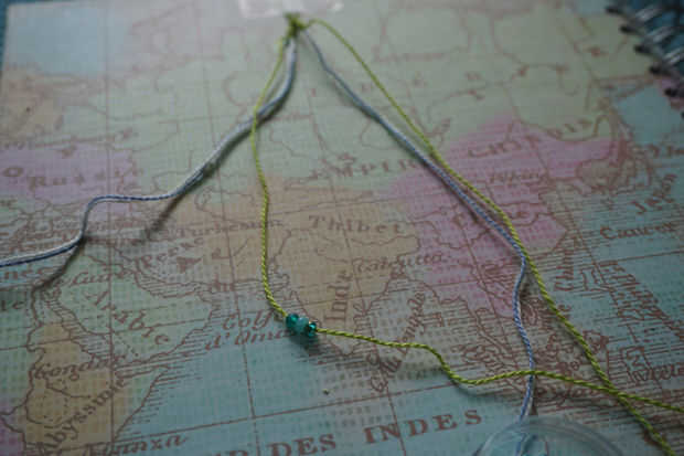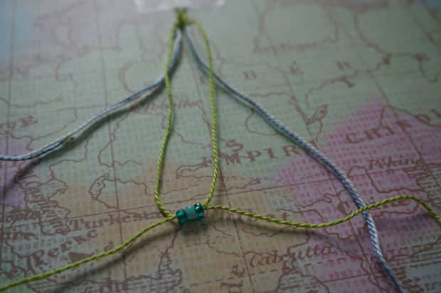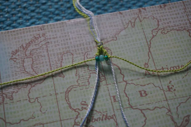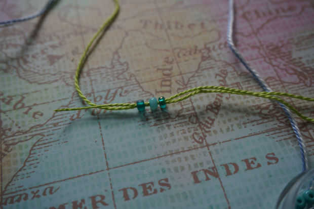 Las tres perlas del hilo de rosca sobre uno de los filamentos del color sólo se utiliza (el verde). Luego tomar el otro hilo y páselo a través de las cuentas de la manera opuesta. Tire de ambos extremos de los hilos de rosca (verde) para que los granos se dibujan perfectamente contra las roscas previamente anudadas. Ahora pasará al siguiente color.