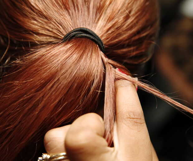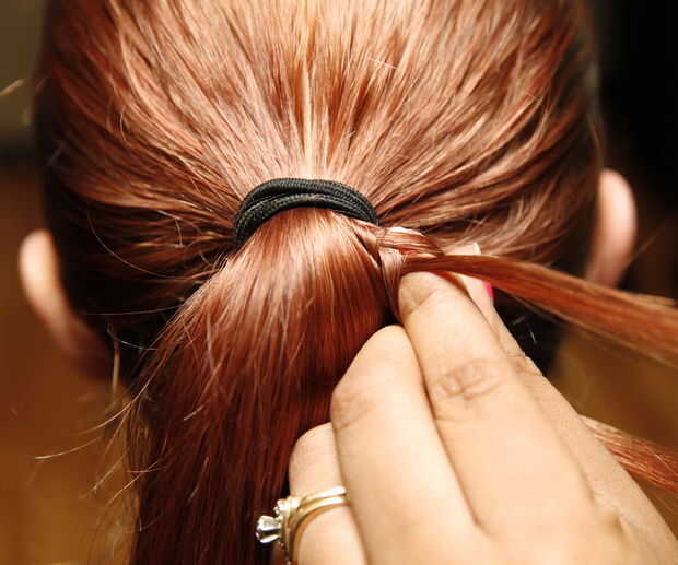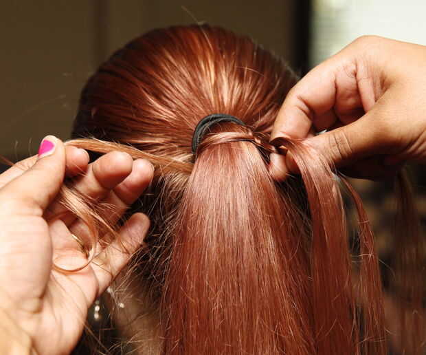 Iniciar una trenza pequeña justo al lado de centro. Sostener la hebra que está a la derecha, dejó el centro uno colgar, alcance debajo de la cola de caballo y tomar una hebra de cabello del lado derecho y ponerla debajo y alrededor de la cola de caballo. Este filamento se convierte en su filamento de la trenza izquierda.