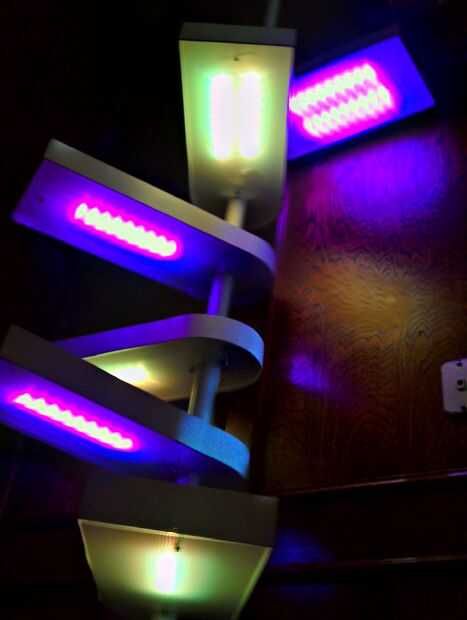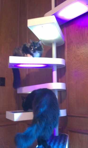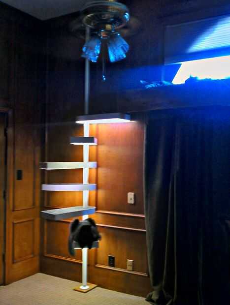 La columna vertebral de la escalera es el poste Stolmen de IKEA, con accesorios para bloquear los pasos en el lugar de montaje. Cada paso es dos pies de largo, suelo de moqueta en la parte superior y tiene una cámara de luz en la parte inferior. Las medidas van desde 2' a 7' del suelo. La luz principal es proporcionada por 27' de la cinta LED blanca y tiras de LED que cambian de color proporcionan iluminación de ambiente. Los pasos son muy robustos y no temblar, incluso con nuestros gatos de 15 lb.