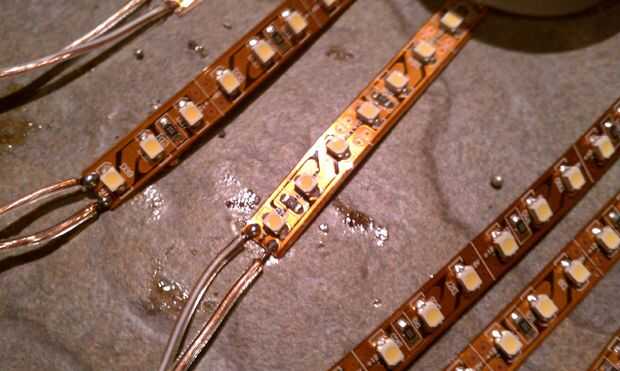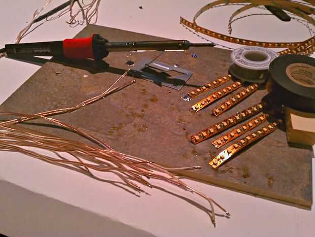 Punta: Utilice un poco de pegamento caliente para fijar la cinta al paso. La cinta tiene un forro adhesivo, pero sólo llevó a cabo durante un par de días tuve que rehacer las luces...