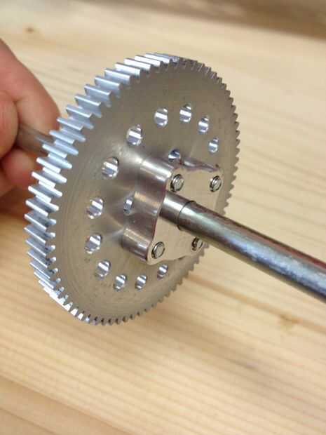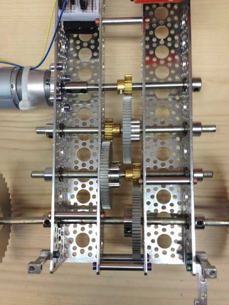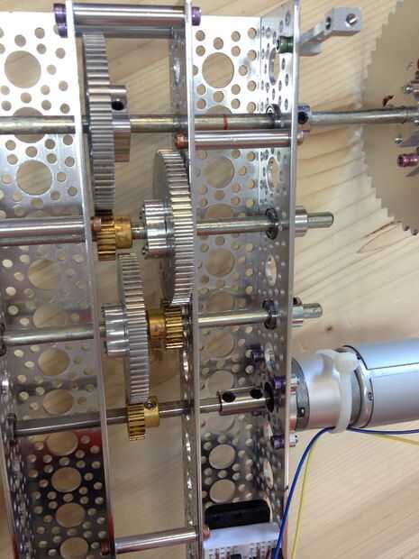 Estos dos engranajes tienen una proporción de 3 a 1. Se configuran para reducir la velocidad y aumentar el esfuerzo de torsión por un factor de tres para cada una de las 3 etapas. La velocidad máxima resultante es aproximadamente 11,6 rpm. Esto surgió a través de algún ensayo y error; puede comenzar con una más orientada hacia abajo el motor para comenzar con.