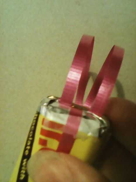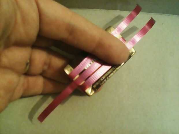 Tomar uno de los bares que tiene las cintas pegadas al frente. Coloque la barra sobre su superficie frontal lateral hacia abajo. Ahora toma los extremos de la cinta y dobla sobre la parte posterior de la barra (ver imagen). No con cinta adhesiva, sólo mantienen en su lugar.