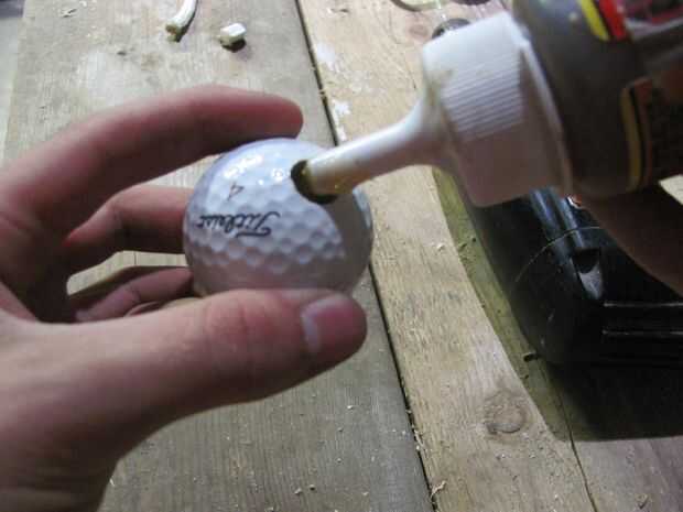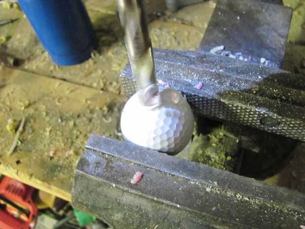 De la bola, I simplemente perforar un agujero de 3/8 de pulgada a la mitad de la bola, llena de pegamento del gorila y empujado en una pequeña sección de la cuerda.
