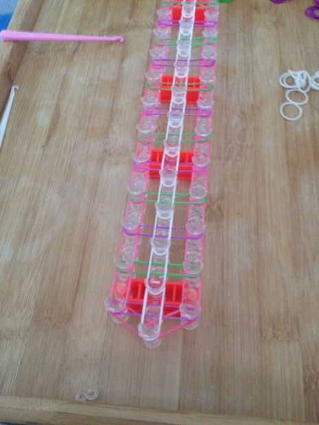 esta es una de las primeras pulseras que aprendí en mi telar. Cantidades pueden variar en diferentes telares.Paso 1: materiales You will need:Banda 26 de fuera20 bandas para escalera12 para la mediaSegún bandas de tamaño de muñecaTelarGanchoClipPaso