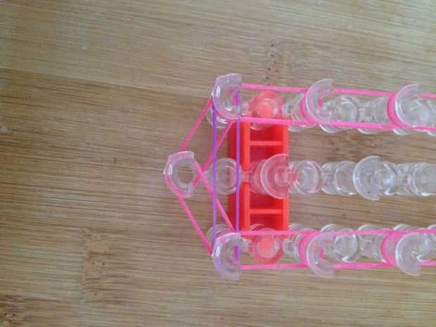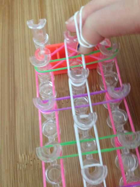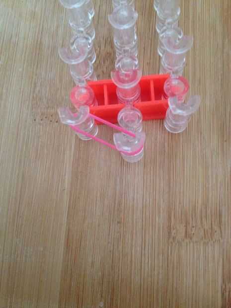 Paso 1: A partir de la frontera Primero vas a empezar con el telar de las flechas hacia arriba. Luego tienes que colocar una banda de goma de cerdo medio en la clavija izquierda luego la clavija media en la clavija de la derecha.Paso 2: Hacer de la f