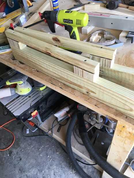 Tomar las dos piezas más largo y 4 1 1/2" piezas. Pone hacia fuera como en la foto. Primeros perfore dos agujeros en cada 1 1/2" pieza luego sujete a uno de los pedazos más largos. Utilice su 20" 2 x 2 para uso y guía en cuanto a dónde colocar la 1 1/2" piezas. Enrosque el 2 x 4 en el lado fino de la 2 x 4 y luego utilizar un tornillo para sujetar el carril de mano (2 x 2) a cada uno de 1 1/2"(ver foto para mayor claridad)