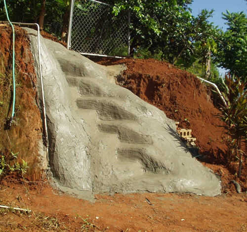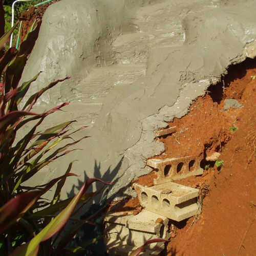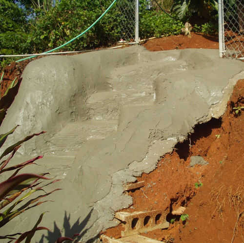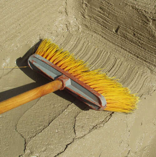 Si el cemento de la mezcla es demasiado espesa para penetrar la red y se adhieren a la capa de fondo, agua abajo algo de él y frotar con su mano enguantada. Poner encima la mezcla más gruesa y crea su textura final. Para las escaleras, barrió la superficie con una escoba para crear la textura final.